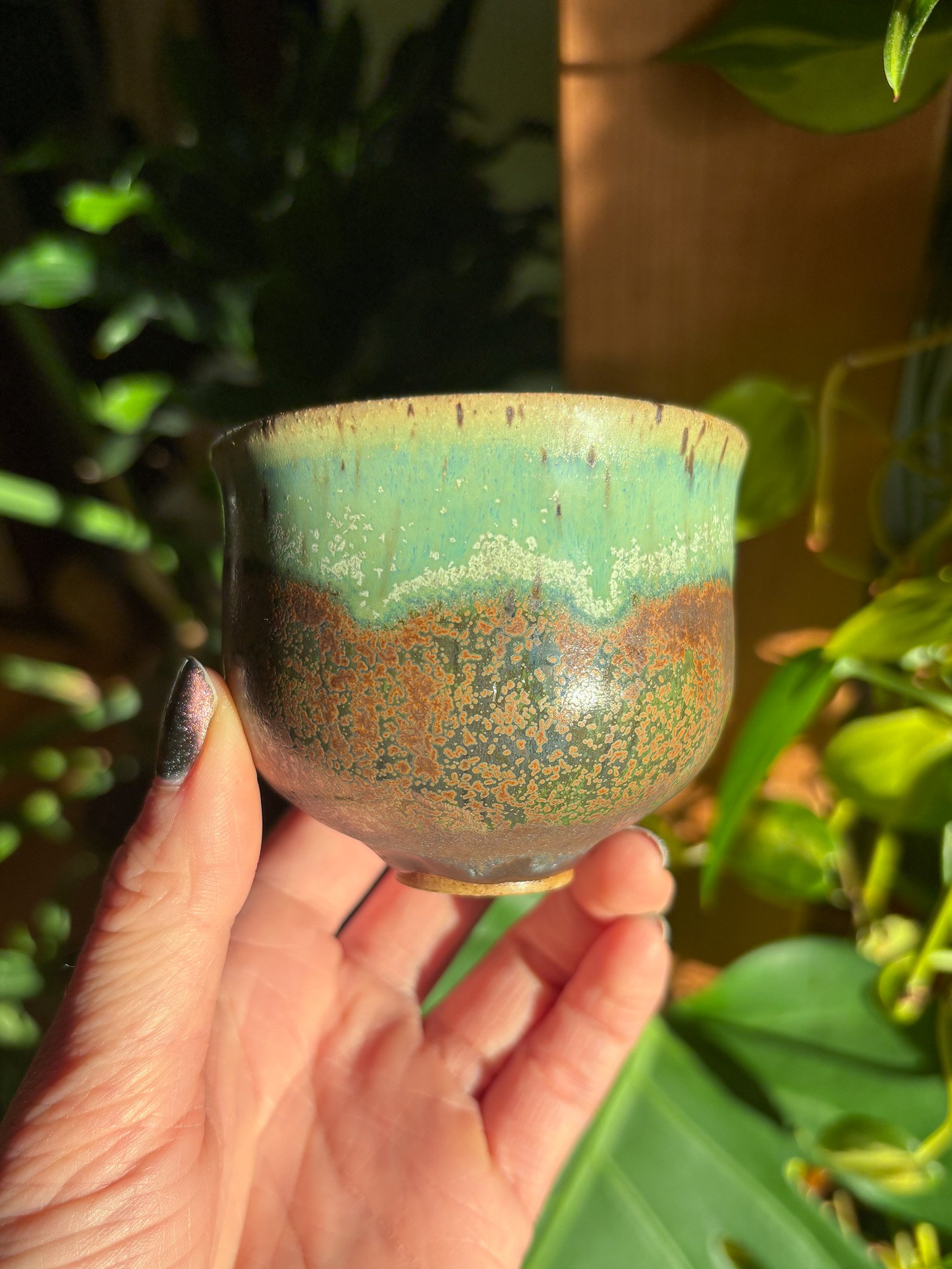 A teacup measuring about 2.25" tall and 2.75" wide, made from brown speckled clay. Glazed with Mayco's Black Walnut and Green Tea glazes on the outside, and Green Tea and Amaco's Emerald Falls on the inside.