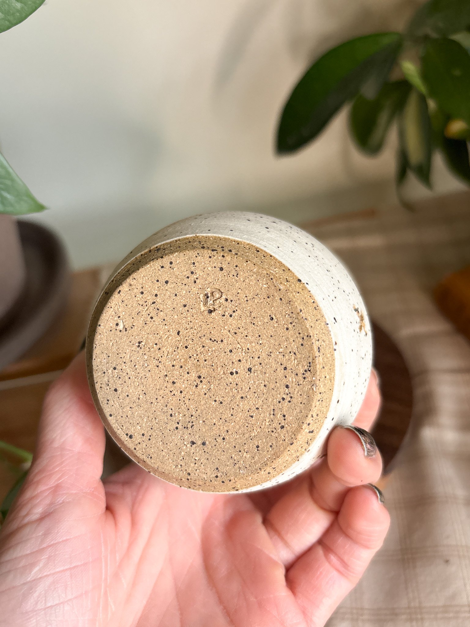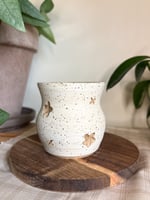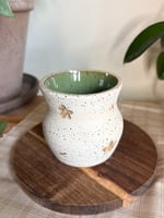 A vase measuring about 3" tall and 2.75" wide, made from brown speckled clay. Painted with white slip on the outside with carved flower and star motifs, and glazed on the inside with Amaco's Lustrous Jade glaze on the inside. The outside is unglazed and matte.