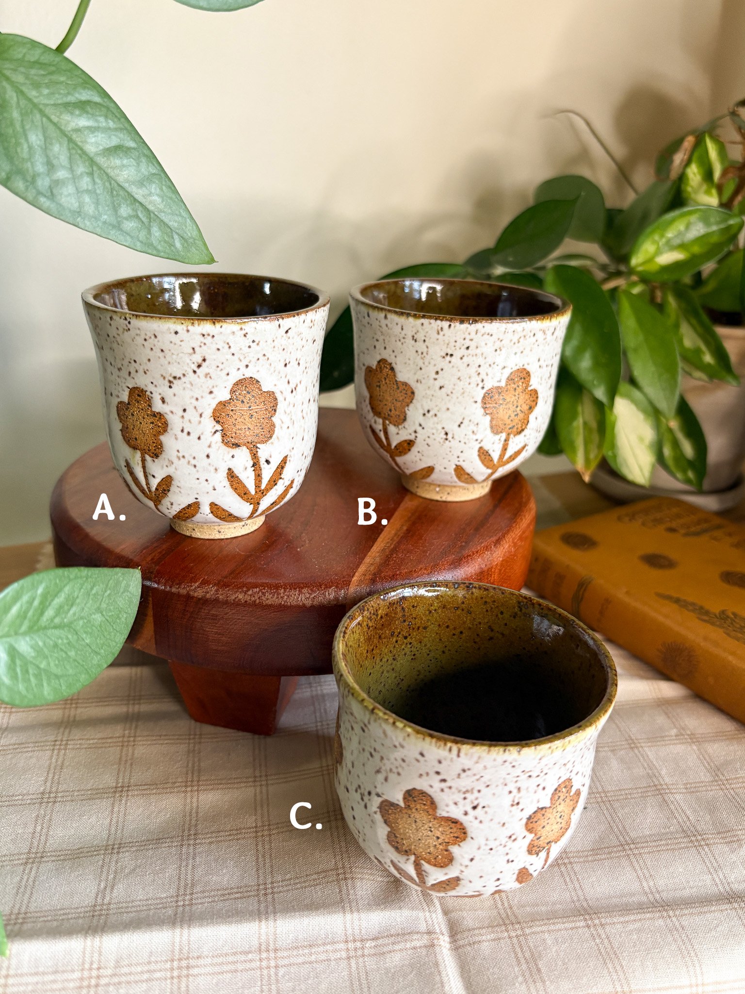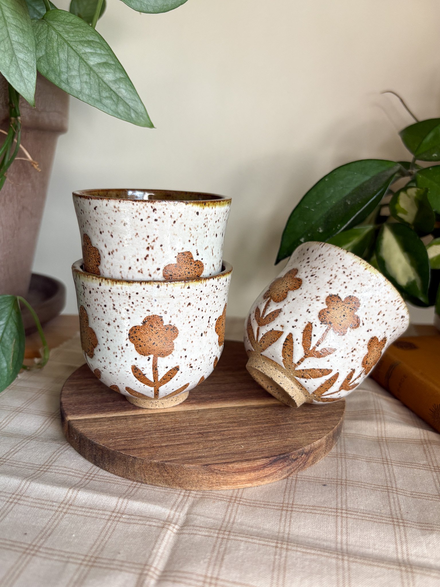 Teacups with a wax-resist daisy design on the outside, made from brown speckled clay. Glazed with white dip glaze on the outside and Amaco's Deep Olive Speckle glaze on the inside.