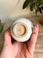 A teacup with a wax-resist dragonfly design on the outside, measuring about 2.5" tall and 2.75" wide made from brown speckled clay. Glazed with white dip glaze on the outside and Amaco's Deep Olive Speckle glaze on the inside.