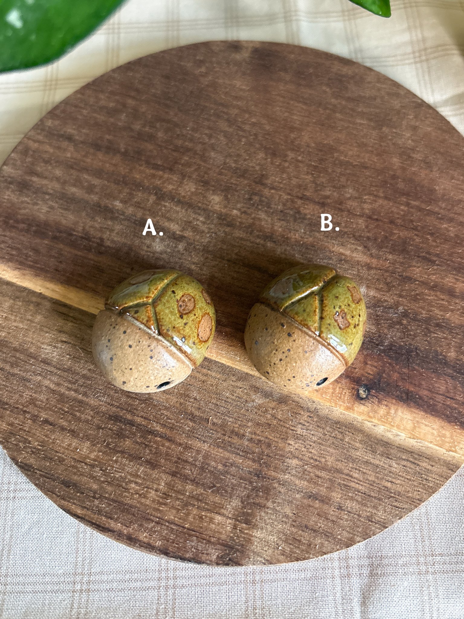 Little striped beetle sculptures perfect for decorating your plant pots and shelves, or just to carry around on adventures! Made from brown speckled clay and glazed with Amaco's Deep Olive Speckle glaze with different wax-resist designs.