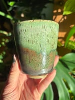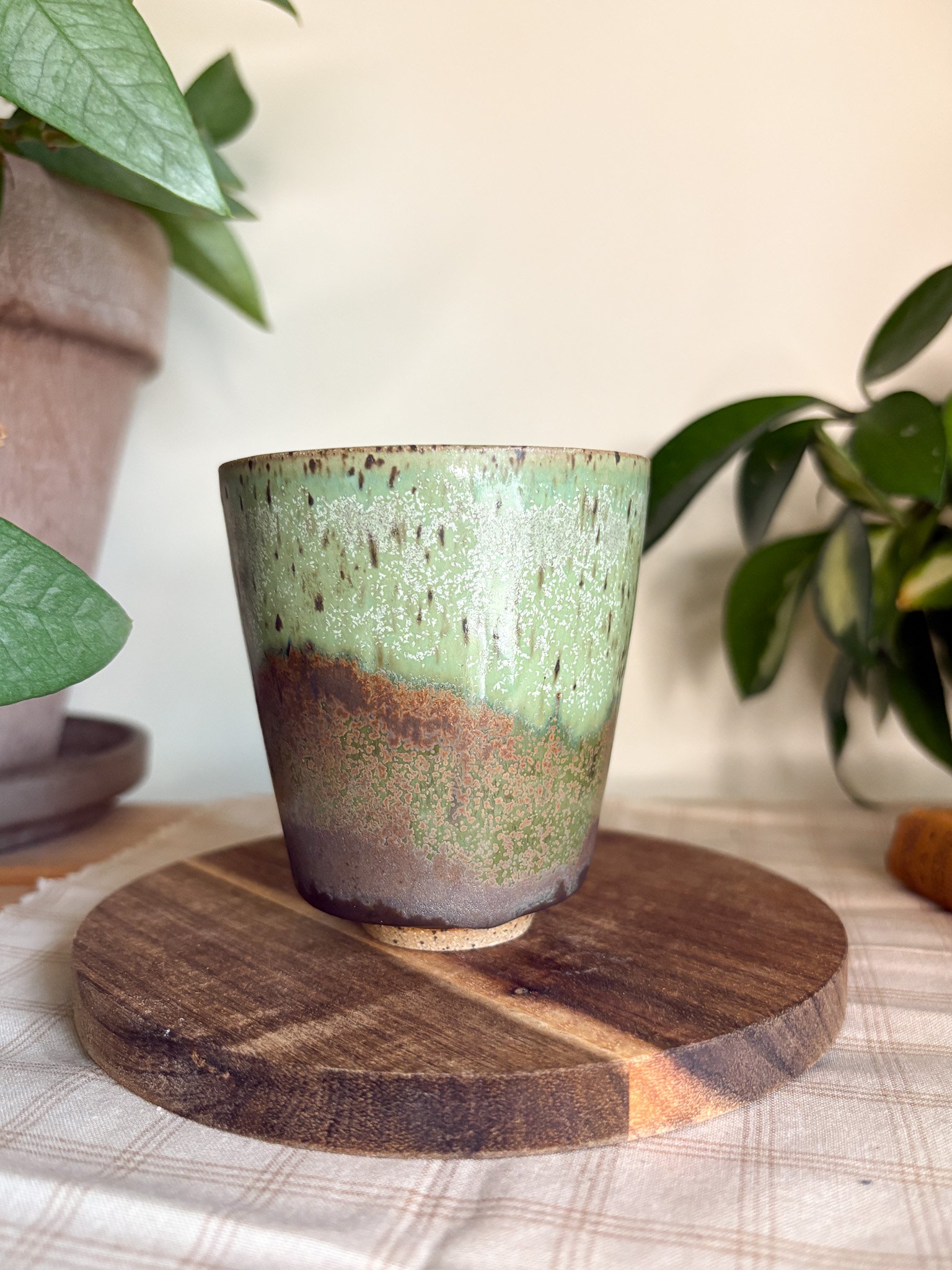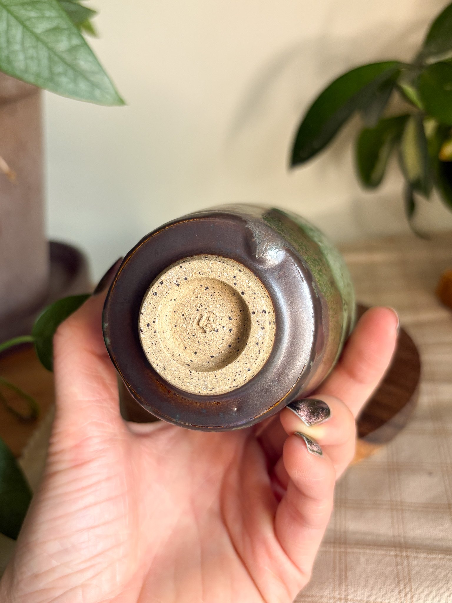 A cup measuring about 3.25" tall and 3" wide. Glazed with Mayco's Green Tea and Black Walnut glazes.