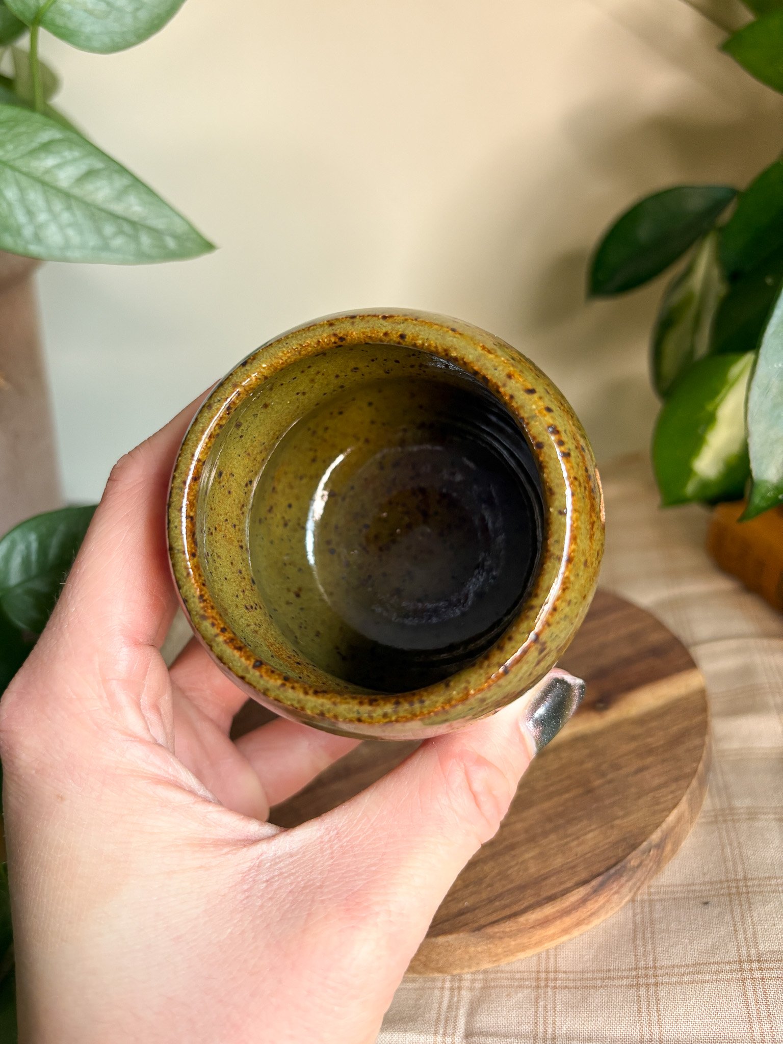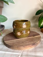 A bubble vase measuring around 2.5" tall and 2.5" wide, made with speckled brown clay. Glazed with Amaco's Deep Olive Speckle glaze. This piece is slightly discounted because it doesn't sit perfectly flat and wobbles a bit!